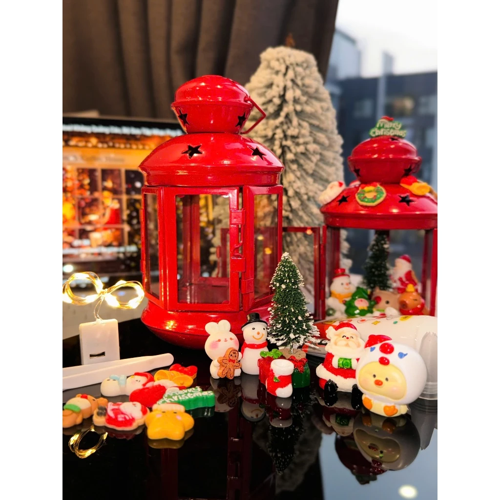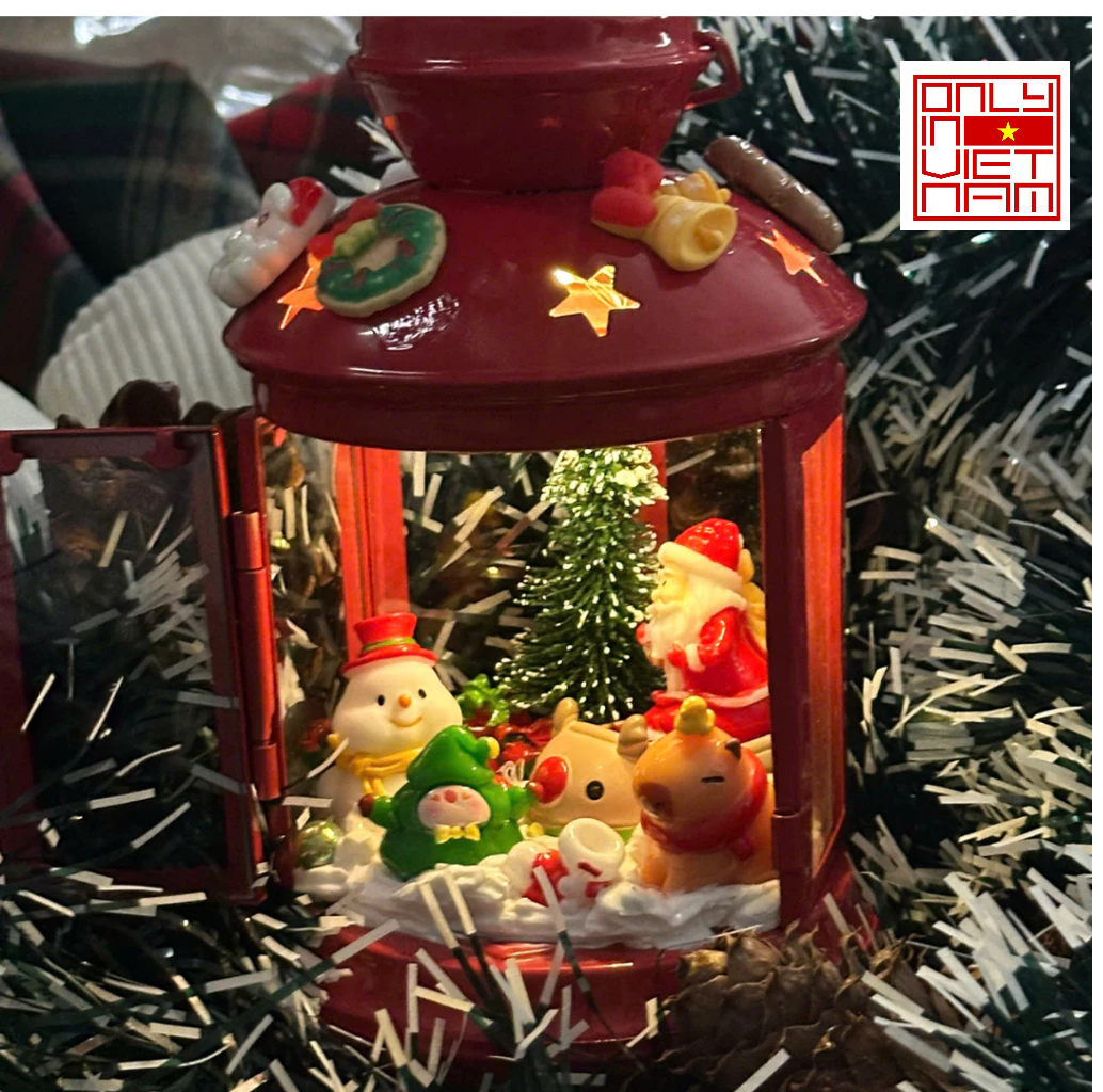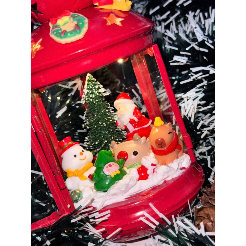 The lantern showcases a unique Christmas-inspired design with charming details such as Santa Claus, Christmas trees, stars, and gift boxes—bringing a joyful and sparkling holiday vibe to any space.